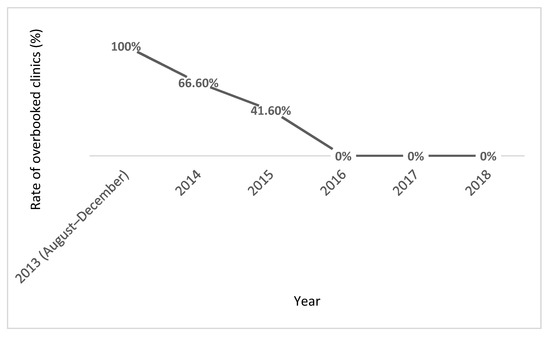Baseline data from outpatient clinic logs showed overbooked specialist (diabetes) antenatal clinics with more than 90 face to face consultations occurring every month (100%) from July to December 2013. After the implementation of the intervention strategy, the rate of months when specialist clinic capacity was exceeded reduced to 8/12 (66.6%) in 2014, with a further reduction to 5/12 (41.6%) in 2015, and has remained at 0% since 2016. (Figure 1).