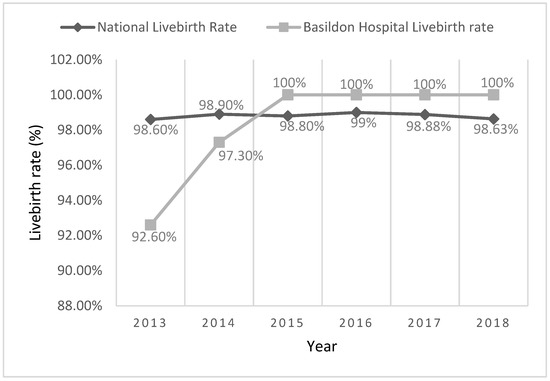 Baseline annual outcome data unveiled our lowest ever live birth rate (92.6%) in Type 1 and 2 diabetics (highest risk patients), significantly worse than the corresponding national rate (98.6% in 2013) according to the National Pregnancy in Diabetes (NPID) Audit report 2013 [24]. After implementation of the intervention strategy, the rate of live births of Type 1 and 2 diabetic women increased to “bridge the gap” in 2014 (97.3% vs. national rate of 98.9%), and finally “hit the mark” in 2015 (100%), where it has remained since (Figure 3). Concurrently in this group of patients, there was continuous improvement in our rate of ideal third-trimester glycaemic control (HbA1c level of <48 mmol/mol), achieving our best ever result of 72.7% in 2018, compared to the corresponding national rate of 57.5%.