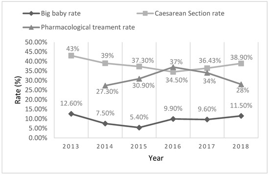Trends in big baby, caesarean section, and pharmacological treatment rates in gestational diabetic women following implementation of the GooD Pregnancy Network in 2014.