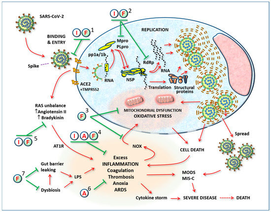 General outline of viral infection and the complications caused by its spread in the body. The substances proposed here for a possible therapeutic effect in coronavirus infection may act in the various stages: (1) preventing binding of the virus to receptors or inhibiting the function of the receptor itself, when it initiates the process of internalization; (2) inhibiting replication by blocking proteases, Non-structural proteins, RNA polymerases, or the assembly of new virus particles; (3) by helping the cell resist viral attack, i.e., by stopping the process of cytotoxicity mediated by oxygen free radicals; (4) by modulating excess inflammatory reactions; (5) by modulating RAS imbalance; (6) by preventing thrombosis; (7) by modulating gut microbiota and preventing systemic release of pro-inflammatory LPS. Abbreviations: SARS-CoV-2: severe acute respiratory syndrome-Coronavirus-2; I: Indomethacin; F: Flavonoids; A: Low-dose aspirin; ACE2: angiotensin-converting enzyme-2; pp1a/1b: polypeptides 1a/1b; Mpro: Major protease (3CL-pro); PLpro: papain-like protease; TMPRSS2: transmembrane serine protease 2; NSP: non-structural proteins; RdRp: RNA-dependent RNA polymerase; LPS: Lipopolysaccharide; NOX: NADPH oxidase; pp1a/1b: polypeptides 1a/1b; Mpro: Major protease (3CL-pro); PLpro: papain-like protease; TMPRSS2: transmembrane serine protease 2; NSP: non-structural proteins; RdRp: RNA-dependent RNA polymerase; LPS: Lipopolysaccharide; NOX: NADPH oxidase; RAS: Renin–Angiotensin System; AT1R: Angiotensin II receptor-1; ARDS: acute respiratory distress syndrome; MODS: multiple organ dysfunction syndrome; MIS-C: multisystemic inflammatory syndrome of children.