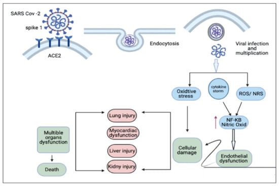 Five main steps are included in the life cycle of the coronavirus: attachment, penetration, biosynthesis, maturation, and release [3]. The main step is the attachment of the virus to the host cell, which is mediated through the Spike (S) protein, which consists of two subunits, S1 and S2, that target the human angiotensin-converting enzyme 2 (hACE2) receptor to bind to human cells in two stages [21]. The first stage depends on initiating the binding to the ACE2 receptor using the S1 subunit, and the second one is to mediate the membrane fusion with the S2 subunit [3]. The ACE2 receptor is highly expressed in the lung, heart, ileum, kidney, bladder, and epithelium, which explains the severe complications in these organs after coronavirus infection [4]. The progression of different complications for severe SARS-CoV-2 infection results from oxidative stress and cytokine storm-inducing multiple organ dysfunction syndromes (MODS) [22]. The pathophysiology of the coronavirus and its related complications are summarized in Figure 1. The following review will discuss different COVID-19-associated complications and the possible curative effect of TQ.