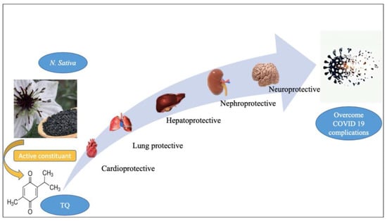 In today’s world, the outbreak of the coronavirus disease 2019 (COVID-19) has spread throughout the world, causing severe acute respiratory syndrome (SARS) and several associated complications in various organs (heart, liver, kidney, and gastrointestinal tract), as well as significant multiple organ dysfunction, shock, and even death. In order to overcome the serious complications associated with this pandemic virus and to prevent SARS-CoV-2 entry into the host cell, it is necessary to repurpose currently available drugs with a broad medicinal application as soon as they become available. There are several therapeutics under investigation for improving the overall prognosis of COVID-19 patients, but none of them has demonstrated clinical efficacy to date, which is disappointing. It is in this pattern that Nigella sativa seeds manifest their extensive therapeutic effects, which have been reported to be particularly effective in the treatment of skin diseases, jaundice, and gastrointestinal problems. One important component of these seeds is thymoquinone (TQ), which has a wide range of beneficial properties, including antioxidant and anti-inflammatory properties, as well as antibacterial and parasitic properties, in addition to anticarcinogenic, antiallergic, and antiviral properties. This comprehensive review discussed the possibility of an emerging natural drug with a wide range of medical applications; the use of TQ to overcome the complications of COVID-19 infection; and the challenges that are impeding the commercialization of this promising phytochemical compound. TQ is recommended as a highly effective weapon in the fight against the novel coronavirus because of its dual antiviral action, in addition to its capacity to lessen the possibility of SARS-CoV-2 penetration into cells. However, future clinical trials are required to confirm the role of TQ in overcoming the complications of COVID-19 infection.