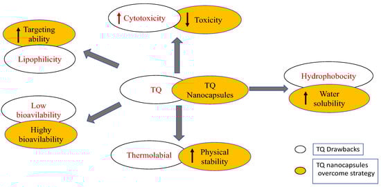 Despite the conspicuous impact and wide biological activities of TQ on various sicknesses, its application has been restricted to exploratory models, which dismissed the clinical assessment of TQ viability, either in animal or human subjects. The translation of the experimental findings into reality is the key factor for the successful application of certain studied drug candidates, and this depends on clinical trials to formulate it into the traditional common forms, such as tablets and capsules [93]. In the last few years, several trials have been applied to develop the pharmaceutical formulation of TQ [94]. However, TQ possesses several toxic effects and physical drawbacks that hinder its pharmaceutical formulation [93], including low stability in aqueous solutions, as an alkaline solution can cause rapid degradation of TQ, as well as its hydrophobic nature, with low water solubility (549–669 μg/mL) and, consequently, low bioavailability [95]. Moreover, TQ is highly sensitive to light and temperature, in addition to non-targeted drug distribution [96]. In this regard, the development of new strategies that maintain the potential therapeutic effect and safety of TQ, with an increase in its clinical preparation and bioavailability, is an important demand [94].