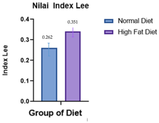 The average Lee index for the normal group was 0.262 ± 0.11 (mean ± SD), lower than the obese group, which was 0.341 ± 0.007. After performing the independent t-test statistical analysis, it was found that there was a significant difference between the two study groups of p = 0.000 (p < 0.01) (Figure 1).