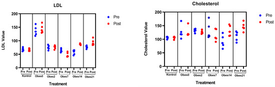 Based on the results of testing the cholesterol value after the exposure of each group, it can be seen that there was a decrease in the control, Obes2, and Obes7 groups. Different results were shown in the Obes14 and Obes21 groups, which resulted in increased cholesterol values after exposure. The results of LDL levels can be seen to decrease in the Obes2 and Obes7 groups. In addition to a decrease, there tended to be an increase in the control, Obes14, and Obes21 groups. A visualization chart can be seen in Figure 2.