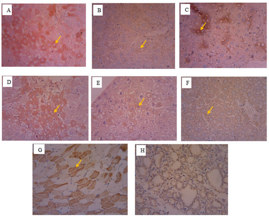 Visualization of the immunohistochemistry results in the liver of the protein expression of SREBP-2 groups: (A) normal, (B) Obes0, (C) Obes2, (D) Obes7, (E) Obes14, (F) Obes21. Mice tonsil preparations were used as the positive control (G) and negative control (H). Arrows indicate SREBP-2 expression.