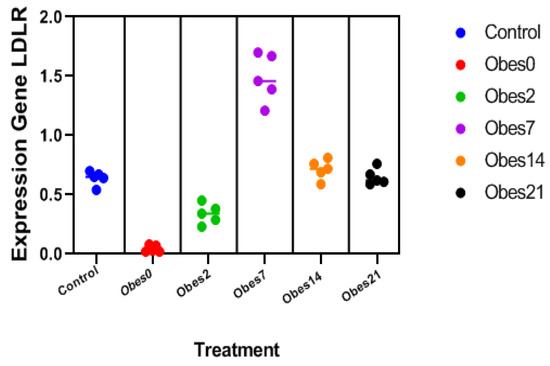 The LDLR gene is located on the surface of liver cells. The LDL receptor will regulate the process of degrading LDL into cells. LDL cholesterol that is in the blood circulation will bind to LDLR, which will be degraded into cells using the process of endocytosis, which will then be stored or excreted in the body. After cholesterol is released, the LDLR recycling process will occur in the cells [17]. Hence, it is necessary to increase LDLR gene expression to reduce LDL in blood circulation. The effect of exposure on LDLR gene expression could be seen when there was an increase in gene expression after the exposure of Obes7 compared to controls. Meanwhile, there tended to be a decrease in expression in Obes14 and Obes21.
