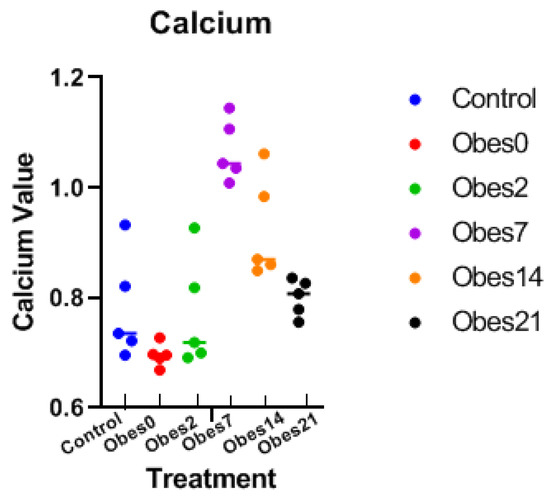 The data are presented in the form of a bar chart. Based on these results, it was found that the calcium value of mice exposed to SMFs was higher than that of mice without exposure. The highest calcium values were seen in the Obes7 group, and they decreased in the Obes14 and Obes21 groups (Figure 5).