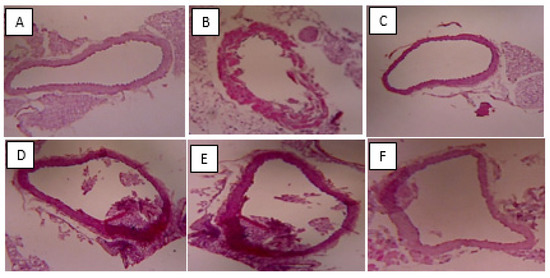 Heart samples were isolated, fixed in 4% formaldehyde for three days at room temperature, and then dehydrated using 70%, 96% (2×), and 100% (2×) alcohol for 1 h each. After that, a clearing process was carried out using xylol I, II, and III for 1 h each. The sample was then embedded in paraffin and cut with a thickness of 5 μm using a microtome. Then, the preparations were deparaffinized, rehydrated, and then given hematoxylin and eosin. After that, observations were made under a microscope. The observations focused on the arterial blood vessels.
