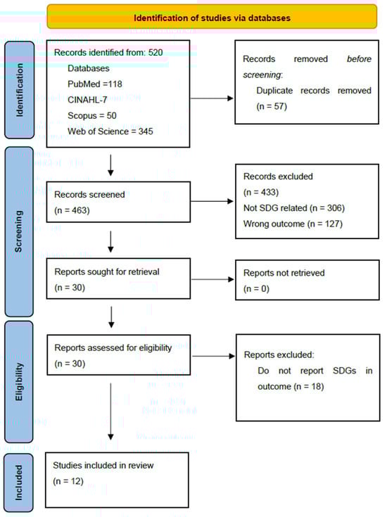 The initial search was conducted on four electronic databases in June 2023 namely Scopus, Cumulative Index to Nursing and Allied Health Literature (CINAHL), Web of Science, and Medline (Pubmed). The search period was between 2015 and June 2023 and was conducted in English. The search started in 2015 which was the period when the SDGs were declared. The search was performed using the following the search strategies enumerated in Appendix A. No protocol was published for this review.