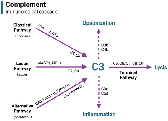 The complement immunological cascade. In immunity, complement is activated through three primary pathways: the classical pathway (by antibody–antigen complexes), the lectin pathway (by bacterial lectins), and the alternative pathway (spontaneous activation). Each pathway is characterized by different pattern recognition receptors and the initial development of a C3 convertase. All activation pathways converge on the C3 component, which is a central point of complement activation. C3 is cleaved to feedback and amplify the cascade, opsonize pathogens for phagocytosis, initiate inflammation, and begin the terminal pathway. Activation of the terminal pathway leads to the creation and insertion of the membrane attack complex (MAC), leading to cell lysis. This figure is a guide to visually portray where complement components functionally reside in the immune cascade throughout the duration of this review. Acronyms and abbreviations are defined in Table 1. Figure was made with BioRender.