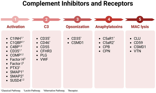 Complement inhibitors and receptors. Complement regulatory proteins are listed based on the cascade point where they function. Acronyms and abbreviations are defined in Table 1. Figure was made with BioRender.