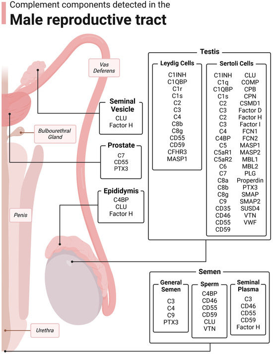 Complement components detected in the male reproductive tract. The male reproductive tract consists of the testis, epididymis, vas deferens, prostate, seminal vesicle, bulbourethral glands, urethra, penis, and semen. Complement has been detected in many of these structures. Figure was made with BioRender.