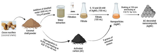 The nanoparticles (AgNPs) were loaded on the activated carbon by simple agitation. In brief, 5.0 g of activated carbon was added to the as-prepared AgNPs’ solution. Then, the mixture was stirred continuously for 1 h at 150 rpm using a Horseshoe IKA agitator. The nanocomposite (AgNC) was further obtained by drying the AgNP-loaded activated carbon powder in an oven (Bluepard Instruments Co. Ltd., Shanghai, China) at 110 °C.