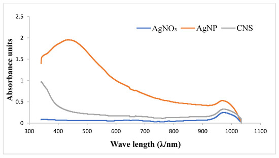 UV–Vis spectra of Cocos nucifera extract (CNS) compared with that of nanoparticles (AgNP) and chemical reagent (AgNO3). AgNO3: silver nitrate; AgNP: silver nanoparticles; CNS: Cocos nucifera extract.