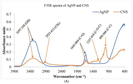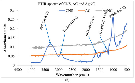 FTIR spectra of nanoparticles and coconut shell (A) coconut shell, activated carbon, and nanocomposites (B) prepared from Cocos nucifera aqueous extract. AC: activated carbon; CNS: Cocos nucifera extract; AgNC: silver nanocomposites; AgNPs: silver nanoparticles; FTIR: Fourier Transform Infrared Spectroscopy.