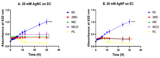 Time–kill curves of various concentrations of silver nanocomposite (A) and nanoparticle (B) on Escherichia coli. Data are presented as the mean ± standard deviation. The graphs (curves) assigned to the stars are significantly different, (*) corresponds to p < 0.05, (****) corresponds to p < 0.0001 (Dunnett test); AgNC: 20 mM of silver nanocomposite; AgNP: 20 mM of silver nanoparticle; EC: Escherichia coli; NC: Negative control; PC: Positive control.