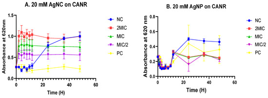 Time–kill curves of various concentrations of silver nanocomposite (A) and nanoparticle (B) on Candida albicans. Data are presented as the mean ± standard deviation. The graphs (curves) are not significantly different (p > 0.05, Dunnett test); AgNC: 20 mM of silver nanocomposite; AgNP: 20 mM of silver nanoparticle; CANR: Candida albicans; NC: Negative control; PC: Positive control.