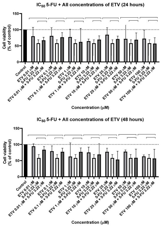 When comparing the cytotoxic effects of 3.22 μM of 5-FU and 50 μM of ETV for 24, 48, and 72 h, the crucial role of time becomes evident. It confirms that for the 72 h period, the combination of 5-FU with ETV induces more cytotoxicity than the drugs used individually—which did not occur for 24 and 48 h. Contrary to our expectations, the cell viability at 50 μM of ETV for 48 h was not lower than for 24 h.