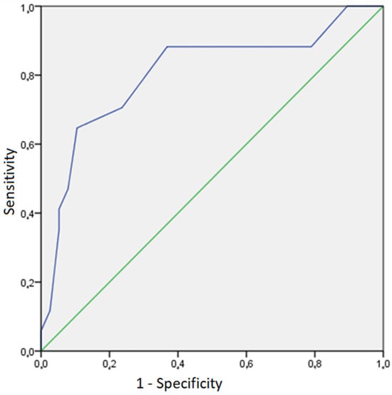 The univariate logistic regression demonstrated that the presence of LVInv exhibited a statistically significant relationship with LN+ (OR 5.25, 1.10–25 95% CI, p = 0.037). A multivariable logistic regression was performed, obtaining a predictive model of LN involvement (X2 = 16.84, p = 0.002) that exhibits a sensitivity and specificity of 41.2% and 94.7%, respectively (Table 4). The Hosmer and Lemeshow test was not significant (p = 0.20). The presence of an NLR greater than 2.60 (OR 6.03, 1.29–28.3 95% CI, p = 0.02) and the presence of LVInv in the TURB sample (OR 9.26, 1.11–77.3 95% CI, p = 0.04) were found to be significantly correlated with the presence LN+. Both fundus lesions (OR 0.21, 0.05–0.93 95% CI, p = 0.04) and creatinine values > 0.94 mg/dL (OR 0.17, 0.03–0.80 95% CI, p = 0.025) were found to be associated with a decreased likelihood of LN+ (Table 4). An ROC curve was generated for the model, resulting in a predictive capacity of 80.4% (area under the curve, AUC), with a 95% CI between 66.6% and 94.2%. This was statistically significant (p < 0.005) (Figure 1). A nomogram from this model was obtained (Figure 2).