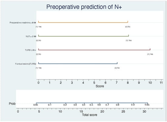 Our model includes LVInv in the pathology specimen of TURB, lesion location in the fundus (OR 0.21), the NLR (OR 6.03), and preoperative creatinine (OR 0.17). The inclusion of LVInv (OR 9.26) in our model is consistent with other studies in which LVInv has been found to be related to the presence of lymph node metastasis both independently and as part of predictive models. These findings are consistent with those reported by Green D. et al. []. This is supported by the hypothesis that the invasion of lymphatic vessels occurs prior to lymph node involvement []. Likewise, the NLR has been studied as a prognostic marker in different carcinomas, including bladder cancer. In this context, higher levels have been found to be associated with recurrence and progression in non-muscle-invasive bladder carcinoma []. Studies such as that by Aoyama et al. have demonstrated a correlation between the NLR and the presence of lymph node metastases in endometrial cancer []. This finding suggests that the NLR has significant potential as a prognostic marker for lymph node involvement in various carcinomas.