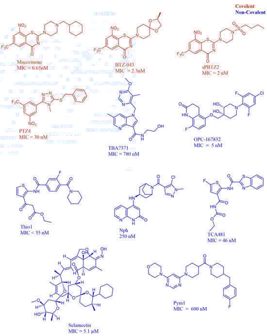 Key representative molecular structures of covalent and non-covalent DprE1 inhibitors.