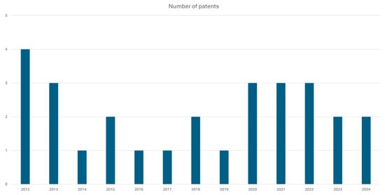 Figure 3. DprE1 inhibitor patents from 2012 [34,35,36,37], 2013 [38,39,40], 2014 [41], 2015 [42,43], 2016 [44], 2017 [45], 2018 [46,47], 2019 [48], 2020 [49,50,51], 2021 [52,53,54], 2022 [55,56,57], 2023 [58,59], 2024 [60,61]. - The absence of DprE1 in the human body mitigates the risk of human toxicities arising from target similarity, enhancing the safety profile of potential inhibitors;