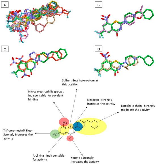 (A) Molecular overlay of different DprE1 covalent ligands; (B) molecular overlay of PBTZ-169 and BTZ-043; (C) PBTZ-169 and PTZ1; (D) PBTZ-169 and CT325. Macozinone pharmacophores.