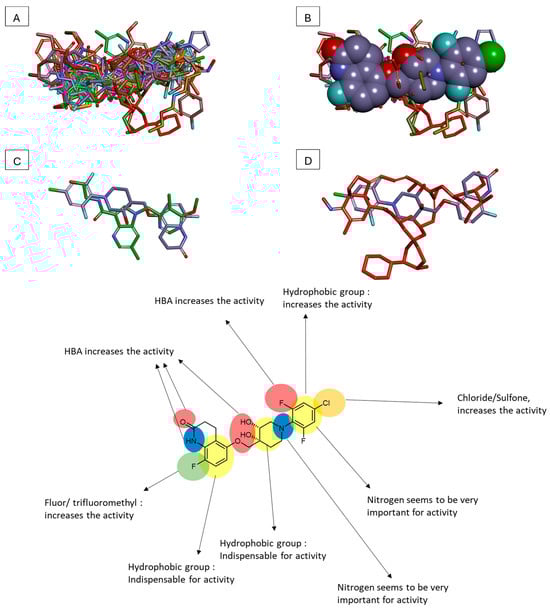 (A) Molecular overlay of different DprE1 non-covalent ligands; (B) with OPC-167832 in balls representation; (C) TBA7371 and OPC-167832; (D) OPC-167832 and Selamectin. OPC-167832 pharmacophores.