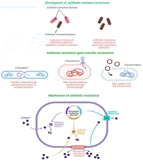 Improper and overuse of antibiotics selects for antibiotic-resistant genes, which confer competitive advantages to the mutated strain. Bacteria transfer resistant genes to other bacteria through several mechanisms, including conjugation, transduction, and transformation (Figure 1). When a bacterium acquires antibiotic-resistance genes, it may render the antibiotic ineffective via several mechanisms, including enzymatic degradation of the antibiotic; alterations of the antibiotic structure or the target structure so that they can no longer bind, pumping antibiotics out of the cell through the action of an efflux pump; or by modifying the cell wall and/or cell membrane structure so that the entry of antibiotics into the cell is inhibited (Figure 1). Previous studies have outlined the mechanisms of antibiotic-resistance gene transfer and how it impacts the efficacy of antibiotics in greater detail, and the reader is referred to those studies for a greater understanding of resistance mechanisms and development [,].