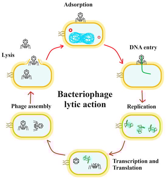 A schematic for antibacterial phage therapy. The phage particle attaches to the bacterial cell surface in the adsorption stage and the DNA enters the cell (DNA entry phase), leaving the viral protein components outside the cell. The DNA is replicated (replication phase). The viral DNA is then transcribed and translated (transcription and translation phase), resulting in the production of the viral protein components. The viral DNA is incorporated into the viral shell proteins and the mature viruses are assembled (phage assembly phase). Finally, bacterial cell lysis occurs (lysis phase), releasing the new viral particles.