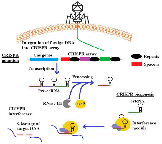 Clustered regularly interspaced short palindromic repeats/CRISPR-associated protein (CRISPR/Cas) provides a mechanism to specifically target bacterial antibiotic resistance genes in a directed sequence-specific manner []. CRISPR/Cas systems are adaptive bacterial defence mechanisms that are directed against infectious viruses and mobile genetic elements (MGEs). Whilst a detailed discussion of the use of CRISPR-Cas technologies is beyond the scope of this study, several recent reviews provide comprehensive summaries of the methodology and recent advancements in the field []. Briefly (as summarized in Figure 3), the use of CRISPR-Cas against pathogens involves three phases: (i) CRISPR adaption, which involves the incorporation of spacer sequences into the CRISPR-Cas cassette; (ii) expression/biogenesis of crRNA and the Cas protein; (iii) and crRNA-guided cleavage of target sequences. When MGEs invade bacteria, specific CRISPR RNAs (crRNA) with complementary sequences direct effector proteins to the targets for enzymatic cleavage, resulting in the sequence-specific elimination of the invading molecule []. CRISPR/Cas systems are divided into two classes, and further classified into six subtypes (I-VI). Although the type I and II CRISPR systems are most commonly used as CRISPR antimicrobials due to their well-understood mechanisms of action and adaptability to genetic modifications, type VI systems have recently been suggested as an alternative. The type VI CRISPR system may inhibit bacterial growth by targeting either the chromosome, or a plasmid []. A notable feature of CRISPR/Cas is its precise targeting ability, as the guide RNA can focus on virulence, antibiotic resistance, or unique genes that are essential genes to pathogen’s survival []. Previous studies have successfully utilized the type II CRISPR/Cas9 system obtained from Streptococcus pyogenes to target S. aureus and E. coli, resulting in cell death in both in vivo and in vitro models []. CRISPR/Cas3 and CRISPR/Cas9 genome editing constructs kill bacteria carrying AMR genes when they are delivered into bacteria by packaging them into specific bacteriophages []. When the phage infects the bacteria, the CRISPR/Cas13a and CRISPR/Cas type VI class 2 systems detect the phage genome transcript, leading to the nonspecific degradation of the bacterial transcripts, thereby blocking bacterial cell growth []. CRISPR/Cas 13a antimicrobials show promise in three main areas: (1) as tools to modify the bacterial flora by targeting and removing specific bacterial populations, without adversely affecting other non-targeted bacteria; (2) as a cost-effective system for detecting and identifying bacterial genes in molecular epidemiological studies, without the need for nucleic acid amplifications or optical devices; (3) as effective antibacterial agents with the ability to target any bacterial gene (including AMR genes), or to selectively eliminate toxin-producing bacteria [].