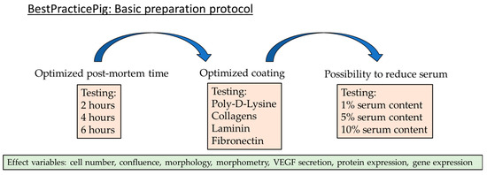 Parameters that are important for the efficiency, differentiation, and expression of the RPE are PMT, plate coating substances, and the serum level of the medium. The outcome parameters of this study are cell number, confluency, morphology, differentiation, protein, and gene expression, as well as VEGF secretion. In addition, basic morphometric data were established for porcine RPE cells. For these parameters, a standard basic protocol for optimized preparation and cultivation was generated and is provided in this study. The overall experimental set up is depicted in Figure 1.