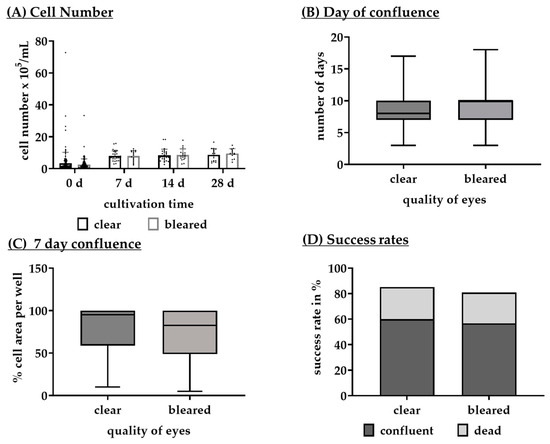 Influence of the qualities of porcine eyes on different parameters. Data to test post-mortem times were collected and evaluated regarding the quality of the porcine eyes divided into clear and bleared eyes. They were evaluated for cell number ((A), n = 13–165), day when they reach 95–100% confluence ((B), n = 81–113), confluence in % on day 7 ((C), n = 94–126) of cultivation, and rates for dead and confluence cultures ((D), n = 34–190). Data for (A) were parametric; mean and standard deviation are depicted. Significances were calculated between each group with analysis of variance (ANOVA) and Student’s t-test. Data for (B,C) was not parametric; median and interquartile ranges are depicted. Significances were calculated between each group with the Kruskal–Wallis test and Mann–Whitney tests. No significant differences were found. Data for (D) are descriptively shown as stacked bars with a percentage ratio. d = days.