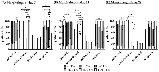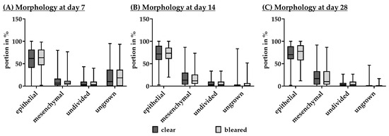 Also, cell morphology was determined after 7 (Figure 4A), 14 (Figure 4B), and 28 days (Figure 4C) of cultivation. Light microscopy images of different areas of the well were visually analyzed for the proportion of epithelial, mesenchymal, and undivided cells, as well as ungrown areas, all as % portions of 100% well area. Data were again very similar between qualities (please refer to Table A1 in Appendix A). Regarding the entire data set, the % of undivided cells between day 7, day 14, and day 28 remained the same at 3.33% at all time points. Ungrown areas were filled up over time, decreasing from 12.50% to 0.00%. These areas were filled up both with mesenchymal cells (from 6.67% to 11.67% and 13.33%, respectively) and epithelial cells (from 63.33% to 72.50% and 73.33%, respectively).