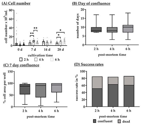Influence of post-mortem time on different culture parameters. Single-eye retinal pigment epithelium cells were prepared after 2, 4, and 6 h post-mortem time and seeded for 7, 14, and 28 days. After different cultivation times, cells were counted ((A), n = 11–112), the number of days until reaching 95–100% confluence was determined ((B), n = 56–91), a confluence area on day 7 of cultivation was estimated ((C), n = 66–94), and the overall survival and confluence success rates were determined ((D), n = 108–143). Data for (A) were parametric; mean and standard deviation are depicted. Significances were calculated between each group with analysis of variance (ANOVA) and Student’s t-test. Data for (B,C) were not parametric; median and interquartile ranges are depicted. Significances were calculated between each group with the Kruskal–Wallis test and Mann–Whitney tests. Data for (D) are descriptively shown as stacked bars with a percentage ratio. * p < 0.05, ** p < 0.01, h = hours, d = days.