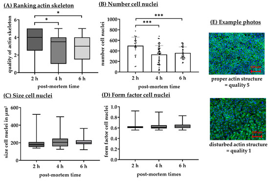 Morphology of actin cytoskeleton and cell nuclei. Single-eye retinal pigment epithelium cells were prepared after post-mortem times of 2, 4, and 6 h and seeded on monomeric collagen I-coated glass slides. After 28 days of cultivation, cell nuclei and actin filaments were stained, and images were taken by fluorescence microscopy. Visual ranking of the quality of the actin cytoskeleton was performed from 0 (disturbed) to 5 (proper) morphology ((A), n = 31–51). Images were evaluated by Fiji (ImageJ2) regarding number of cell nuclei ((B), n = 30–51), cell nuclei size ((C), n = 27–45), and form factor of cell nuclei ((D), n = 27–45). Data for (B) were parametric; mean and standard deviation are depicted. Significances were calculated between each group with analysis of variance (ANOVA) and Student’s t-test. Data for (A,C,D) were not parametric; median and interquartile ranges are depicted. Significances were calculated between each group with the Kruskal–Wallis test and the Mann–Whitney test. * p < 0.05, *** p < 0.001, h = hours. Exemplary photos are shown ((E), cell nuclei = blue, actin filaments = green, 20× objective, scale bar = 100 µm).
