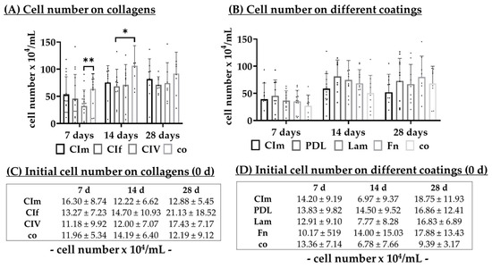 Cell number on different coatings. Before seeding, cells were counted with a trypan blue exclusion assay. ((A), n = 7–17) Cells were seeded on monomeric collagen I (CIm), fibrillar collagen I (CIf), collagen IV (CIV), or uncoated wells (co). ((B), n = 8–16) Cells were seeded on CIm, Poly-d-Lysine (PDL), laminin (Lam), fibronectin (Fn), or co. Cells were counted again after 7, 14, and 28 days of cultivation, and the difference in the seeding cell number is depicted as cell number × 104. The initial cell number mean before seeding is listed for collagen tests ((C), n = 7–17) and for coating tests ((D), n = 8–16). Data were parametric; mean and standard deviation are shown. Significances were calculated between each group with analysis of variance (ANOVA) and Student’s t-test. * p < 0.05, ** p < 0.01, d = days.