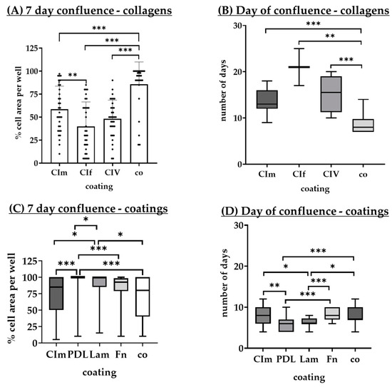 Confluence on different coatings. ((A), n = 29–34; (B), n = 2–20) Single-eye retinal pigment epithelium cells were seeded on monomeric collagen I (CIm), fibrillar collagen I (CIf), collagen IV (CIV), or uncoated wells (co). ((C), n = 28–36; (D), n = 17–27) Cells were seeded on CIm, Poly-d-Lysine (PDL), laminin (Lam), fibronectin (Fn), or co. Confluence as a cell growth area in % of the well was determined with light microscopy after 7 days of cultivation (A,C), and the day of 95–100% confluency was determined (B,D). For (A), data were parametric; mean and standard deviation are shown. Significances were calculated between each group with analysis of variance (ANOVA) and Student’s t-test. For (B–D), data were not parametric; median and interquartile ranges are depicted. Significances were calculated between each group with the Kruskal–Wallis test and the Mann–Whitney test. * p < 0.05, ** p < 0.01, *** p < 0.001.