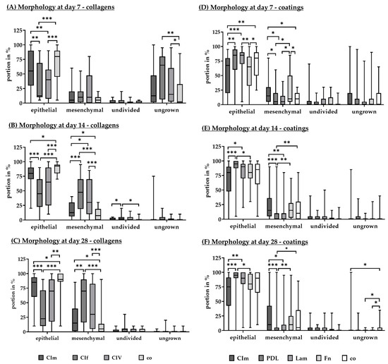 First, different collagens (CIm, CIf, CIV) were tested and compared to the uncoated control (co) (Figure 10A–C). After 7 days of cultivation (Figure 10A), co contained most epithelial cells (median: 80.00% ± 45%), which was significantly higher than CIf (median: 12.50% ± 58.80%, p < 0.001) or CIV (median: 40.00% ± 50.00%, p < 0.001). Also, CIm (median: 55.00% ± 60%) contained more epithelial cells than CIf (p = 0.004) or CIV (p = 0.040). Ungrown areas were the least likely to be found with co (median: 2.50% ± 32.50%). CIf (median: 65.00% ± 73.75%, p = 0.003) and CIV (median: 15.00% ± 57.50%, p = 0.030) showed significantly more gaps in the cell layer compared to co. After 14 days of cultivation (Figure 9B), again, co contained most epithelial cells (median: 92.50% ± 15.00%), which was significantly higher than CIf (median: 45.00% ± 47.50%, p < 0.001), CIV (median: 65.00% ± 65.00%, p < 0.001), or CIm (median: 80.00% ± 20.00%, p = 0.020). CIm had significantly more epithelial cells than CIf (p < 0.001). Accordingly, co had the fewest mesenchymal cells (median: 7.50% ± 18.80%), which was significantly lower than CIf (median: 47.50% ± 51.20%, p < 0.001), CIV (median: 30.00% ± 60.00%, p = 0.001), or CIm (median: 12.50% ± 23.75%, p = 0.040). CIm had significantly fewer mesenchymal cells than CIf (p < 0.001). After 28 days of cultivation (Figure 10C), all conditions reached full confluency (no ungrown areas, all medians: 0.00% ± 0.00%). Undivided cells were quite few, with CIf showing the most (CIm median: 0.00% ± 3.75%; CIf median: 5.00% ± 5.00%; CIV median: 0.00% ± 5.00%; co median: 0.00% ± 5.00%). Most epithelial and the least number of mesenchymal cells were achieved on uncoated wells (median: 90.00% ± 13.70% and 5.00% ± 13.80%, respectively), followed by CIm (median: 85.00% ± 33.80% and 15.00% ± 38.75%, respectively). Co condition showed significantly more epithelial cells than CIm (p = 0.001), CIf (median: 22.50% ± 61.30%, p < 0.001), or CIV (median: 70.00% ± 72.50%, p = 0.001). Also, CIm contained more epithelial cells than CIf (p < 0.001). Correspondingly, co contained significantly fewer mesenchymal cells than CIm (p = 0.030), CIf (median: 70.00% ± 73.70%, p < 0.001), or CIV (median: 30.00% ± 77.50%, p < 0.001). Additionally, CIm had significantly fewer mesenchymal cells than CIf (p = 0.002).