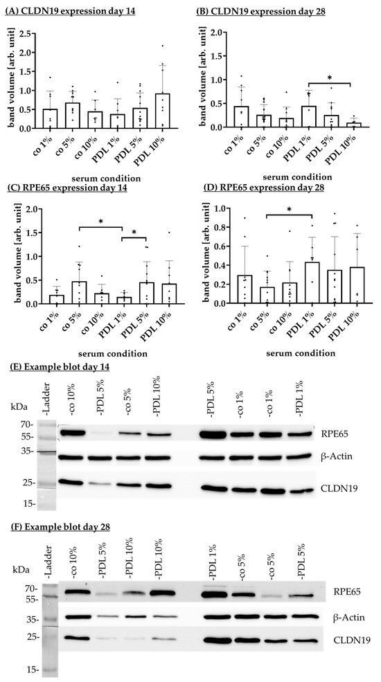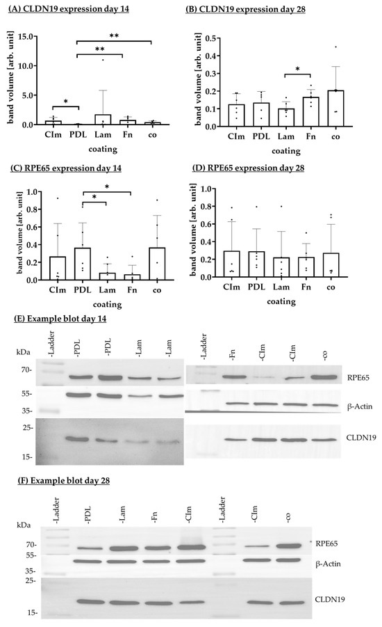 RPE65 and CLDN19 are physiologically expressed RPE proteins, indicating differentiation and tight junction formation [40]. RPE cells were seeded on CIm, PDL, Lam, Fn, or on uncoated wells (co), and protein expression of RPE65 and CLDN19 was investigated with Western blotting (Figure 12 with example images) after 14 and 28 days of cultivation.