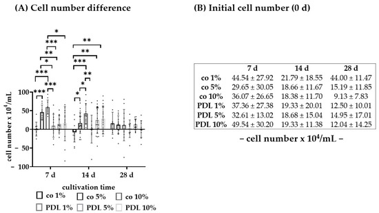 Regarding cell numbers, data for all PMT were summarized and descriptively evaluated concerning seeding cell number and success of the culture (Table 2). A living and successful culture was defined as containing cells that were quantifiable in a trypan blue exclusion assay (showing a living cell number of at least 0.05 × 105 cells/mL) over the course of 28 days of cultivation. Overall, the mean and median cell seeding numbers between successful (living) and unsuccessful (dead) cultures were not relevantly different. However, a seeding cell number of at least 1 × 105 cells/mL increased the success rate, as in dead cultures, cell number was more often below 1 × 105 cells/mL than in succeeding cultures (61.70% compared to 28.39% for living cultures).