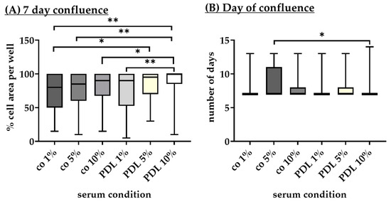 The next step was to investigate the confluence of the coatings’ PDL, Lam, and Fn, together with CIm and co. Regarding 7-day confluency (Figure 9C), PDL reached complete confluency (median: 100.00% ± 0.00%), which was significantly different to CIm (median: 85.00% ± 50.00%, p < 0.001), Lam (median: 100.00% ± 15.00%, p < 0.030), Fn (median: 92.50% ± 19.70%, p < 0.001), or co (median: 80.00% ± 60.00%, p < 0.001), respectively. Lam also exhibited full confluency on day 7, and this was significantly higher than CIm (p = 0.020) and co (p = 0.030). Concerning the day of full confluence (Figure 9D), PDL was the first to reach it (median: day 6.00 ± 3.00). This effect was significantly different compared to CIm (median: day 8.00 ± 4.00, p = 0.007), Fn (median: day 8.00 ± 3.00, p < 0.001), or co (median: day 7.00 ± 3.00, p < 0.002), respectively. The second best coating regarding the day of confluence was Lam (median: day 6.00 ± 1.25). This was significantly better than CIm (p = 0.030), Fn (p < 0.001) or co (p = 0.020), respectively. Overall, confluence on day 7 and time to reach full confluence was optimal with PDL.