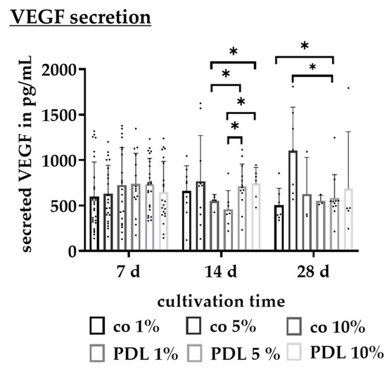 To assess the secretion of VEGF-A of single-eye RPE cells cultured on different coatings (CIm, PDL, Lam, Fn, and co), supernatants were collected for 4 h on days 7, 14, and 28 after preparation and analysis with VEGF ELISA (Figure 11). Secreted VEGF ranged from 735.33 ± 164.03 pg/mL (PDL, 28 days) and 1109.33 ± 276.78 pg/mL (co, 28 days), which was in the normal range of the VEGF secretion of primary porcine mix culture RPE [39]. On day 7 and day 14, no significant differences between coatings were detected. On day 28 of cultivation, Lam showed significantly higher VEGF-A concentrations than PDL (mean: 1038.50 ± 248.47 pg/mL compared to 735.33 ± 164.03 pg/mL, p = 0.009), Fn displayed significantly lower concentrations than Lam (mean: 738.00 ± 161.08 pg/mL compared to 1038.50 ± 248.47 pg/mL, p = 0.020), and co showed significantly higher concentrations than Fn (mean: 1109.33 ± 276.78 pg/mL compared to 738.00 ± 161.08 pg/mL, p = 0.010) or PDL (mean: 1109.33 ± 276.78 pg/mL compared to 735.33 ± 164.03 pg/mL, p = 0.006). It is of interest that the previously determined most suitable coating, PDL, displayed the lowest VEGF secretion.