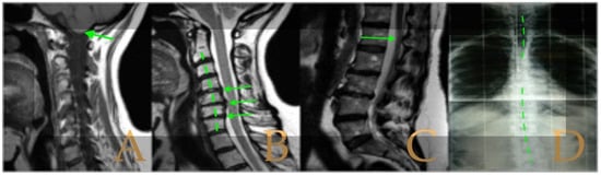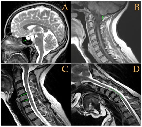 The MRI showed (Figure 9): descent of the cerebellar tonsils, ischemic foci in the white matter of the cerebral hemispheres, and oedema in the optic nerve sheaths. Kyphosis of the cervical spine (especially C5-C6-C7). Tense aspect of the cervical spinal cord. Disc disease: C3-C4-C5-C6-C7-T1. Ischemia and cervical and thoracic oedema. Straightening and scoliosis of the thoracic spine. Lumbar lordosis straightening. Conus medullaris at the level of the middle third of L1. Postsurgical changes in L4-L5 (disc prosthesis). The full-spine X-rays showed cervical, thoracic, and lumbar scoliosis, with the biggest curve being dextroconvex of wide radius in the thoracic and lumbar region.