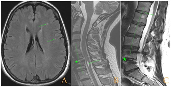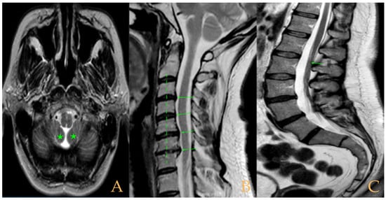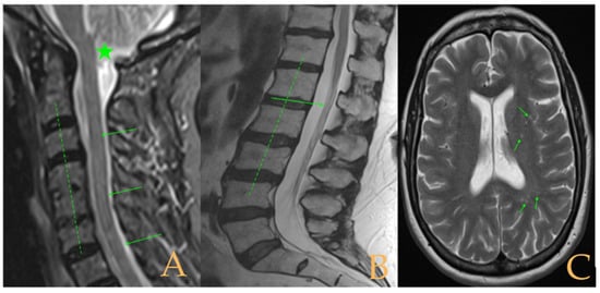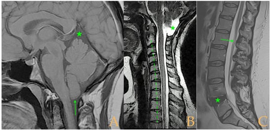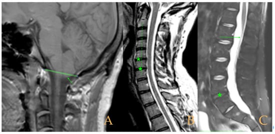 Imaging of patient 8. A: MRI of the posterior fossa with descent of the cerebellar tonsils (arrow) below McRae line (green line); B: cervical MRI with straightening of the cervical spine (interrupted line) and C5-6-7 disc disease (stars); and C: conus medullaris at the level of the lower third of L2 (arrow) and L5S1 disc disease (star).