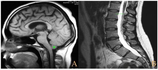 Imaging of patient 5. A: Moderate descent of the cerebellar tonsils (star) and B: conus medullaris in upper third of L2 (arrow).