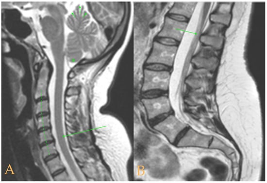 The MRI showed descent of the cerebellar tonsils, 13 mm pineal cyst, and multiple disc protrusions in T4-T8 and T9-T10, with herniation T5-T6. Straightening of the thoracic and lumbar spine. Low conus medullaris at the upper third level of the L2 vertebra (Figure 7). The full-spine X-rays showed a mild double-curved thoracic and lumbar scoliosis (<10° Cobb), and lower extremity dysmetria with shortening of the left lower extremity estimated to be 3 mm at the level of the acetabular roofs and 7 mm at the level of the iliac crests. Dextroconvex lumbar scoliosis was estimated to be 2°, and levoconvex cervicothoracic scoliosis was estimated to be 10° (both total, including all vertebrae). The estimated lateral curves, including all vertebral bodies in each region, were cervical lordosis 25°, thoracic kyphosis 34°, and lumbar lordosis 53°.