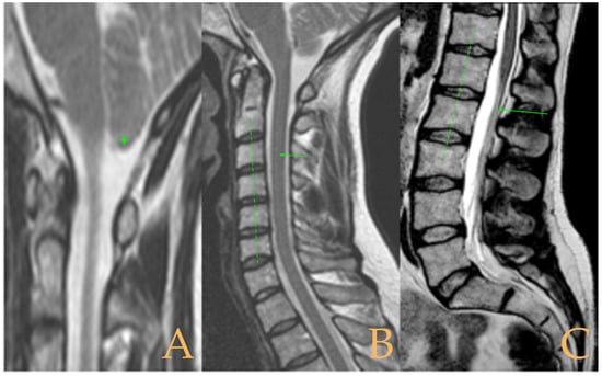 - Eppelheimer, M.S.; Houston, J.R.; Bapuraj, J.R.; Labuda, R.; Loth, D.M.; Braun, A.M.; Allen, N.J.; Pahlavian, S.H.; Biswas, D.; Urbizu, A.; et al. A Retrospective 2D Morphometric Analysis of Adult Female Chiari Type I Patients with Commonly Reported and Related Conditions. Front. Neuroanat. 2018, 12, 2. [Google Scholar] [CrossRef] [PubMed]