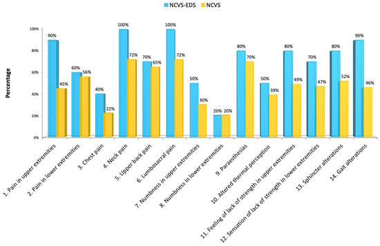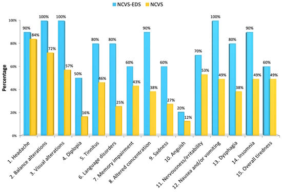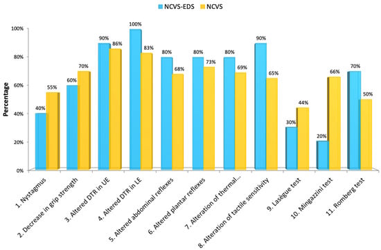 In the objective examination, patients with NCVS–EDS show alterations comparable to the group of 373 patients with NCVS, but with significantly more alterations in the deep tendon reflexes in the lower extremities, alterations in tactile sensitivity, and positive Mingazzini test.